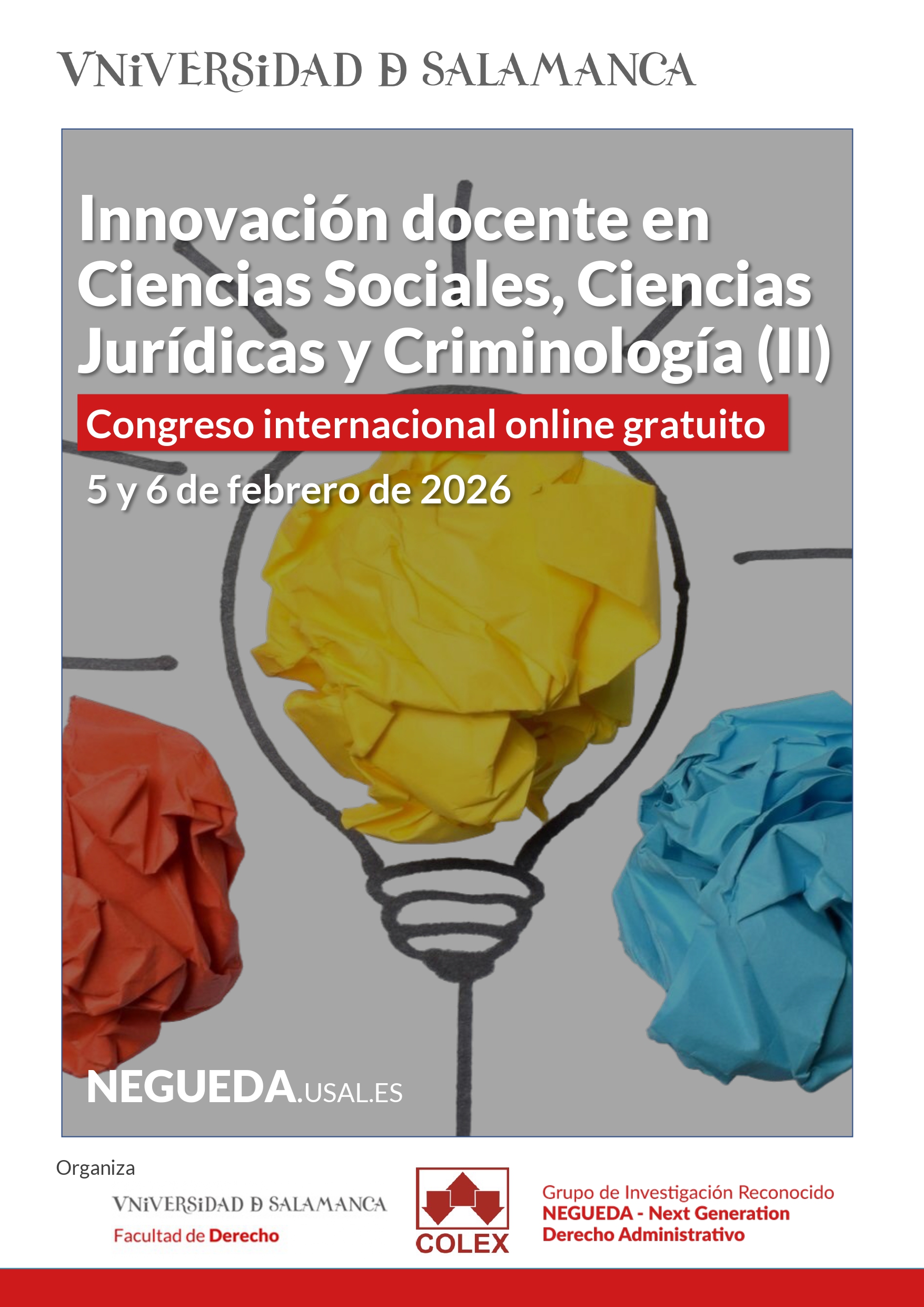 La segunda edición del Congreso Internacional “Innovación docente en Ciencias Sociales, Ciencias Jurídicas y Criminología” es una iniciativa de la Facultad de Derecho de la Universidad de Salamanca que aspira a crear un espacio de reflexión e intercambio de experiencias destinado a aquellas personas que se encuentran en los primeros estadios de la carrera docente e investigadora y que anhelan la puesta en marcha de nuevas metodologías docentes que contribuyan a maximizar el aprendizaje y la adquisición de competencias y habilidades prácticas del estudiantado del campo de las Ciencias Sociales, Ciencias Jurídicas y Criminología.