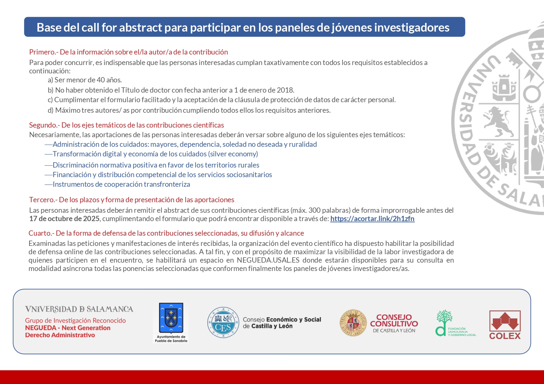 Con la finalidad de visibilizar y poner en valor la labor investigadora de quienes comienzan su difícil andadura en el ámbito universitario y dedican importantes cotas de esfuerzo a la búsqueda de soluciones innovadoras para afrontar el reto demográfico y territorial, la organización de la actividad ha creado diversos paneles destinados a jóvenes investigadores. A continuación, se facilitan las bases del